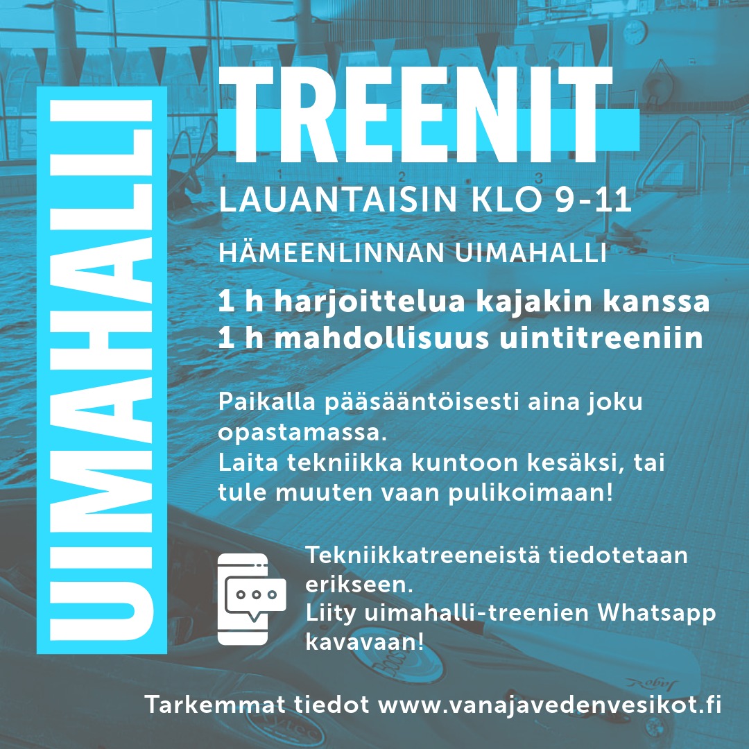 Talvikaudella on mahdollisuus osallistua viikoittaiseen tekniikka- ja turvallisuusharjoitteluun uimahallissa. Vesikkojen vuoro on lauantaisin klo 9.00-11.00 Hämeenlinnan uimahallilla. Käytössä alakerran ryhmä pukuhuoneet. Sivuovesta kun tulee sisään on portaat oikealla, josta alas ja sieltä löytyy miesten ja naisten pukuhuoneet. Saunaan täytyy kulkea allasosaston läpi. Pukukaapit saa lukkoon uimahallista ostettavalla rannekkeella, jos sitä ei löydy niin arvotavarat voi myös ottaa kassissa mukaan altaan reunalle.